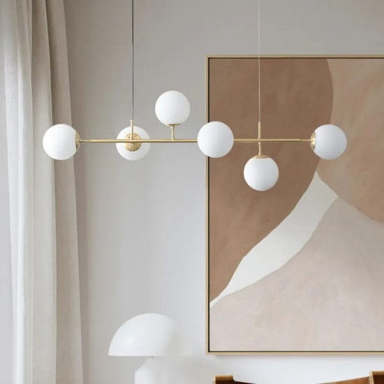 Elit's 6 White Globe Pendant with Gold Finish is an elegant and eye-catching lighting piece, perfect for adding a luxurious touch to any room. Its suspended design and gilded finish provide a sophisticated and sparkling look, turning the chandelier into a focal point of the decor.